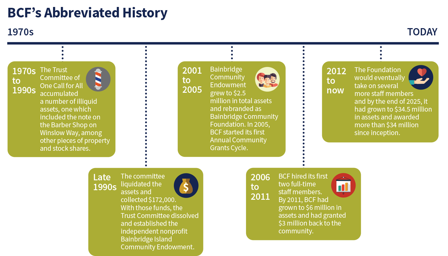 With the blessing of the One Call for All board, the Trust Committee dissolved and established the independent nonprofit, Bainbridge Island Community Endowment -- a chartered grant-making organization that would analyze the needs of our community, prioritize and address those needs, and anticipate how to foster quality of life for island residents in the near and long term. Bainbridge Island Community Endowment was organized under IRS Section 501(c)(3) as a community foundation, though the organization did not adopt the name Bainbridge Community Foundation until 2005, to avoid confusion with the Bainbridge Foundation.