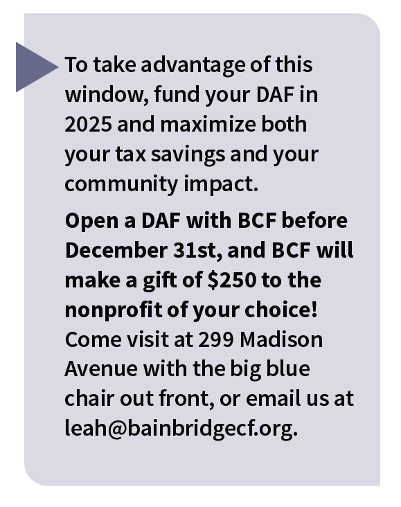 If you’re 70½ or older, you may already know a Qualified Charitable Distribution (QCD) from your IRA is a smart way to support the causes you care about while also reducing your taxable income. One of the most effective ways to make a QCD work harder is by creating a Donor Designated Fund at Bainbridge Community Foundation. By directing your QCD into a designated fund, you can support specific nonprofits or areas of interest year after year while also avoiding taxes on your distribution. This approach allows you to transform required IRA withdrawals into a steady, impactful stream of support, ensuring your generosity is felt both now and for generations to come. Contact us to learn more.