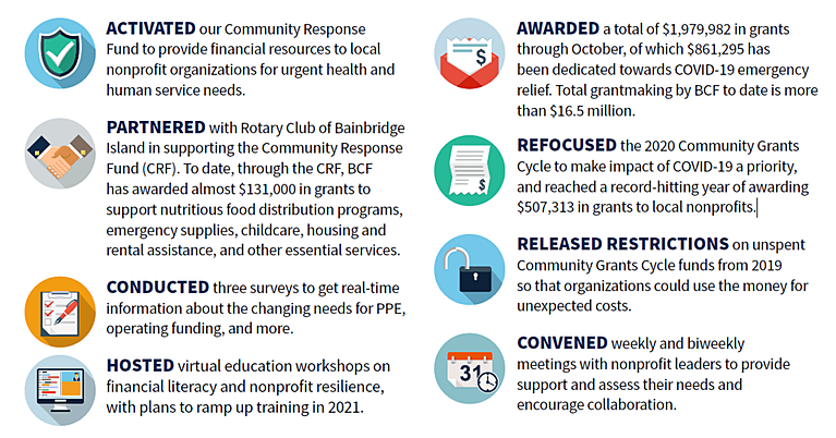 We are stronger together. This is a phrase we hear often today, but how do we know it’s true? Imagine our forests. Individual trees can flourish on their own, but they are stronger when living together—with other trees nearby they share nutrients, create a local ecosystem in which they thrive, and act as buffer for each other during inclement weather. A forest is greater than the sum of its parts. Community foundations help create a similar environment by supporting nonprofits that are critical to the place we call home. Specifically, Bainbridge Community Foundation (BCF) works in partnership with dozens of local nonprofits through promoting collaboration, analyzing community needs, awarding grants to meet those needs, and connecting donors to nonprofits. In 2019, BCF had one of its best years yet by having a remarkable fundraising year, ramping up its programmatic and educational work through trainings and workshops, and creating new partnerships with local organizations to support affordable housing and student assistance programs. The success of 2019 made BCF uniquely positioned to respond to the consequences of the COVID-19 crisis. As of October 31, 2020, BCF has taken the following actions to support the community: